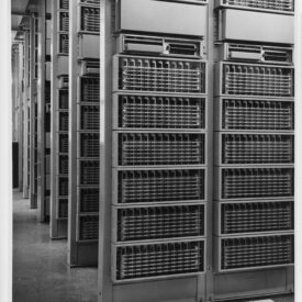 Fotografia em preto e branco, em Minas Gerais. No primeiro plano, equipamentos da estação telefônica. No segundo plano, corredor com uma série de equipamentos indo até o fim da sala.
