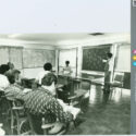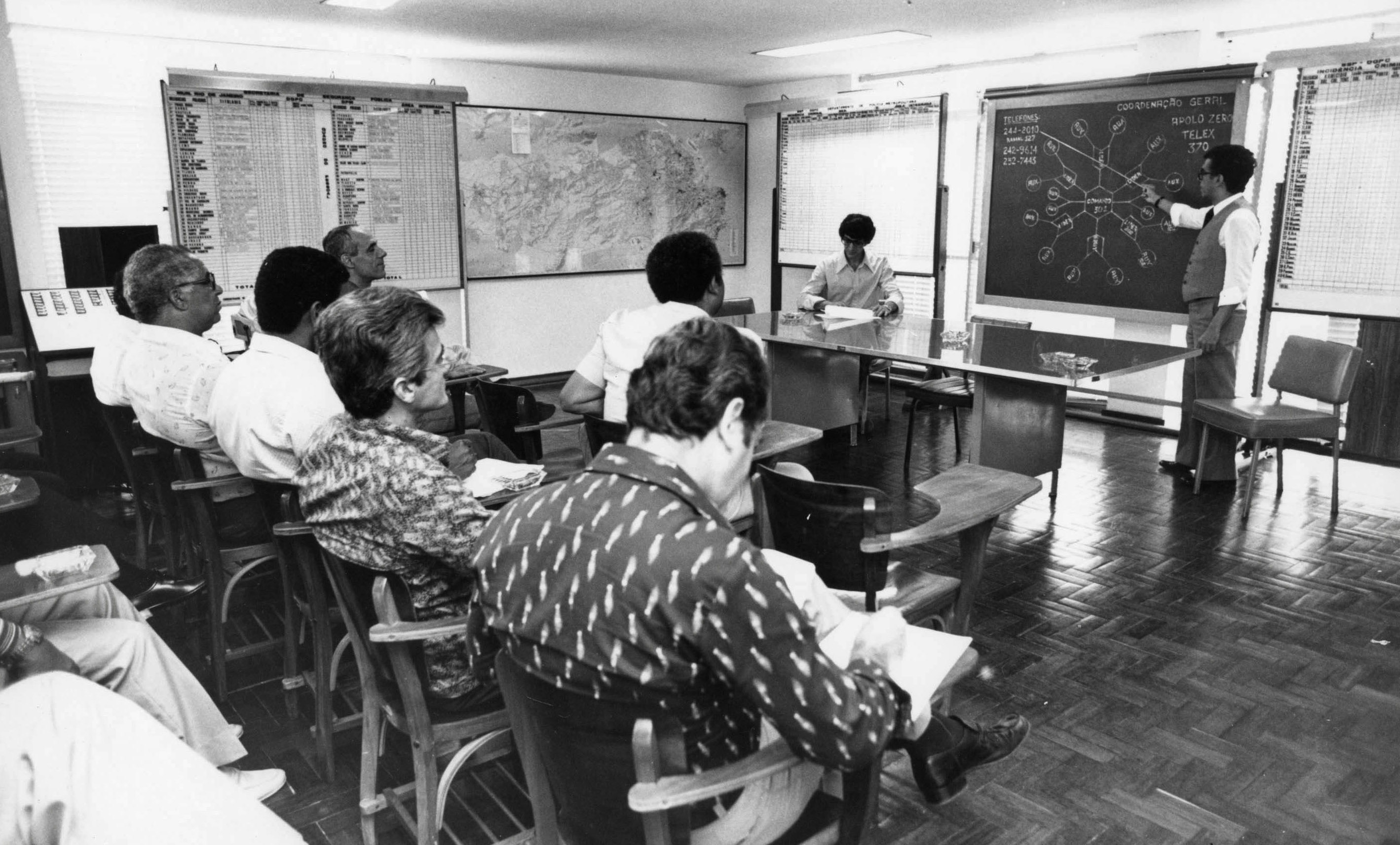 Fotografia em preto e branco. No primeiro plano e no segundo plano, funcionários sentados em carteiras escolares, trabalhando no Plano Integrado da Polícia Civil - Atendimento por telefone, tendo ao fundo, espécie de quadro negro, mapas e planilhas.