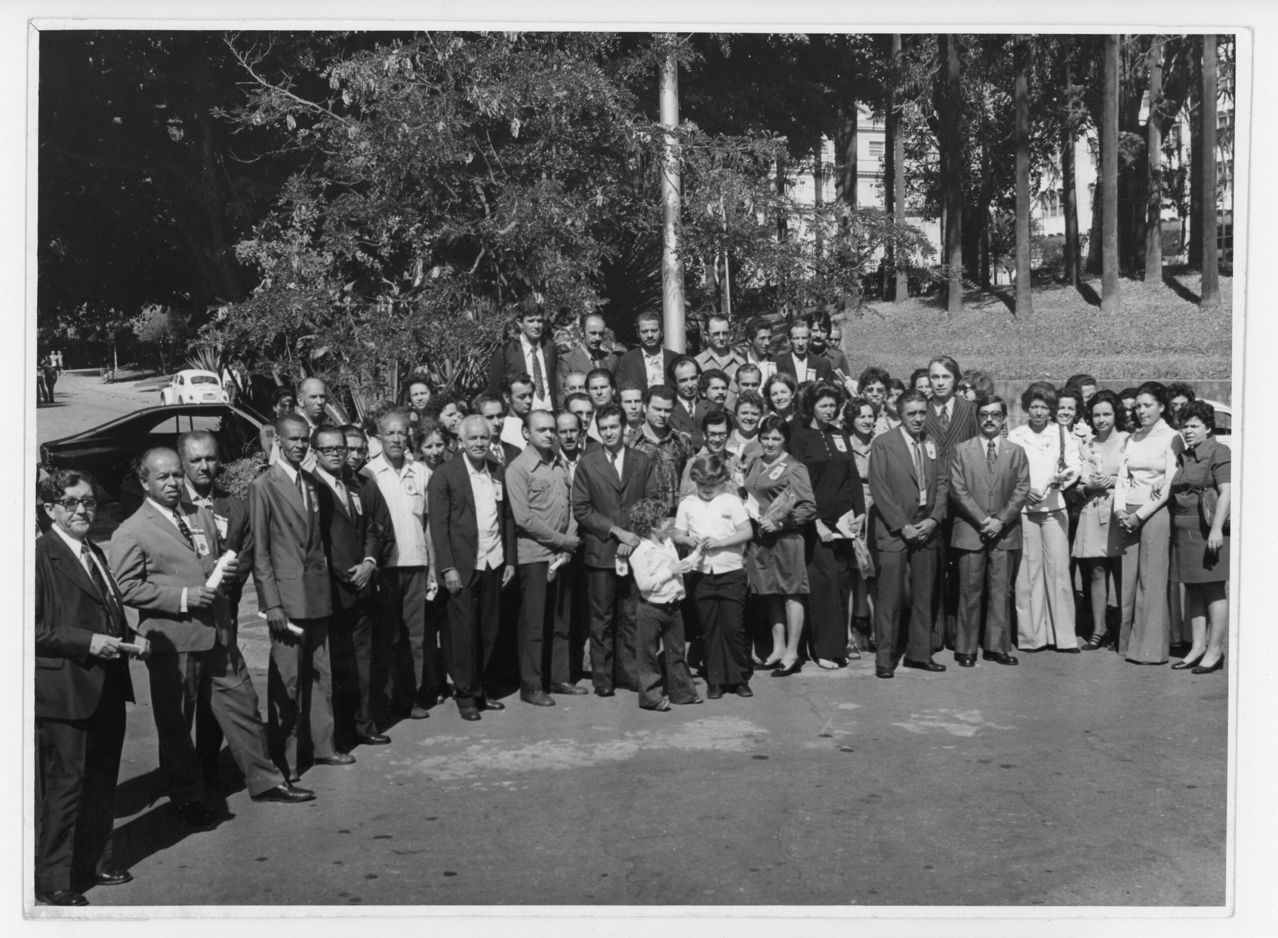 Fotografia em preto e branco. No primeiro plano, grupo de pessoas em pé, sendo eles possivelmente funcionários aposentados da Telemig. À frente do grupo, ao centro, duas crianças. No segundo plano, pessoas em pé em altura elevada. Atrás deles, parte de planta. Ao fundo, à esquerda, fusca. À direita, gramado com árvores.