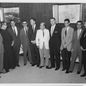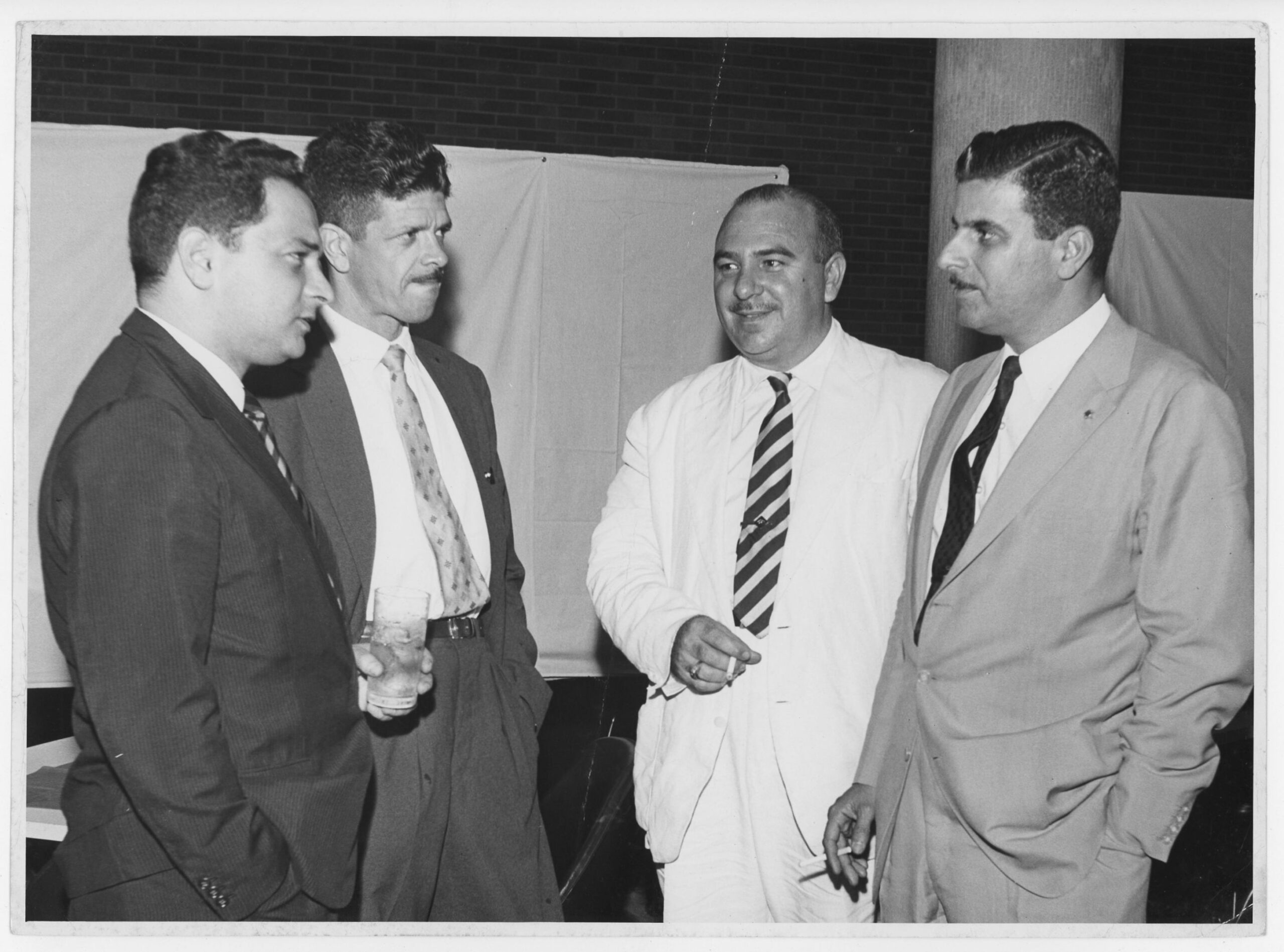 Fotografia em preto e branco. No primeiro plano, quatro homens de terno, com o primeiro segurando um copo, o segundo com as mãos no bolso e o terceiro e o quarto segurando cigarros. O quarto homem é o diretor Augusto de Lima. Ao fundo, parede com tecidos pendurados e pilastra no lado direito.