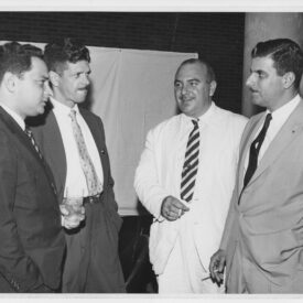 Fotografia em preto e branco. No primeiro plano, à esquerda, partes de duas pessoas de costas. Atrás, mesa com papéis, arranjo de flores e um telefone em cima. No segundo plano, grupo de homens em pé, estando à frente Theobaldo Antonio Kopp segurando papel e falando em microfone em pedestal à sua frente. Ao fundo, janelas com persianas recolhidas mostrando pessoas do lado de fora.