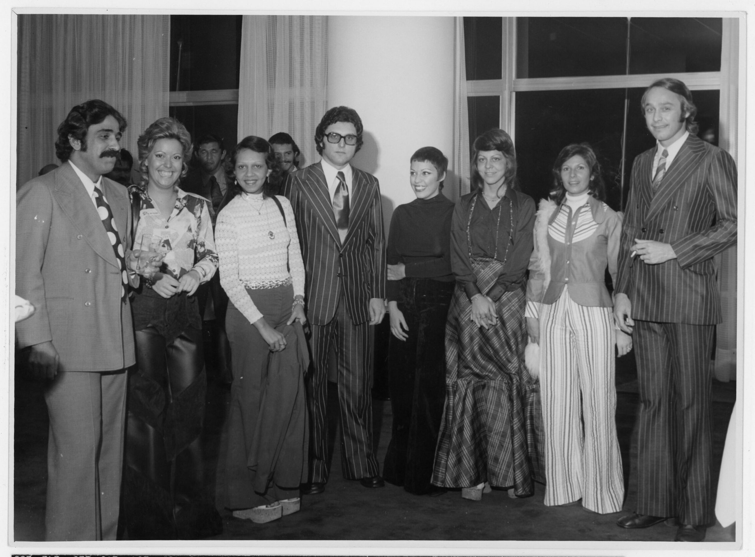 Fotografia em preto e branco em Minas Gerais. No primeiro plano, grupo de homens e mulheres em pé. O homem da esquerda está segurando copo. No segundo plano, à esquerda, pessoas em pé. Ao fundo, parede com janelas.