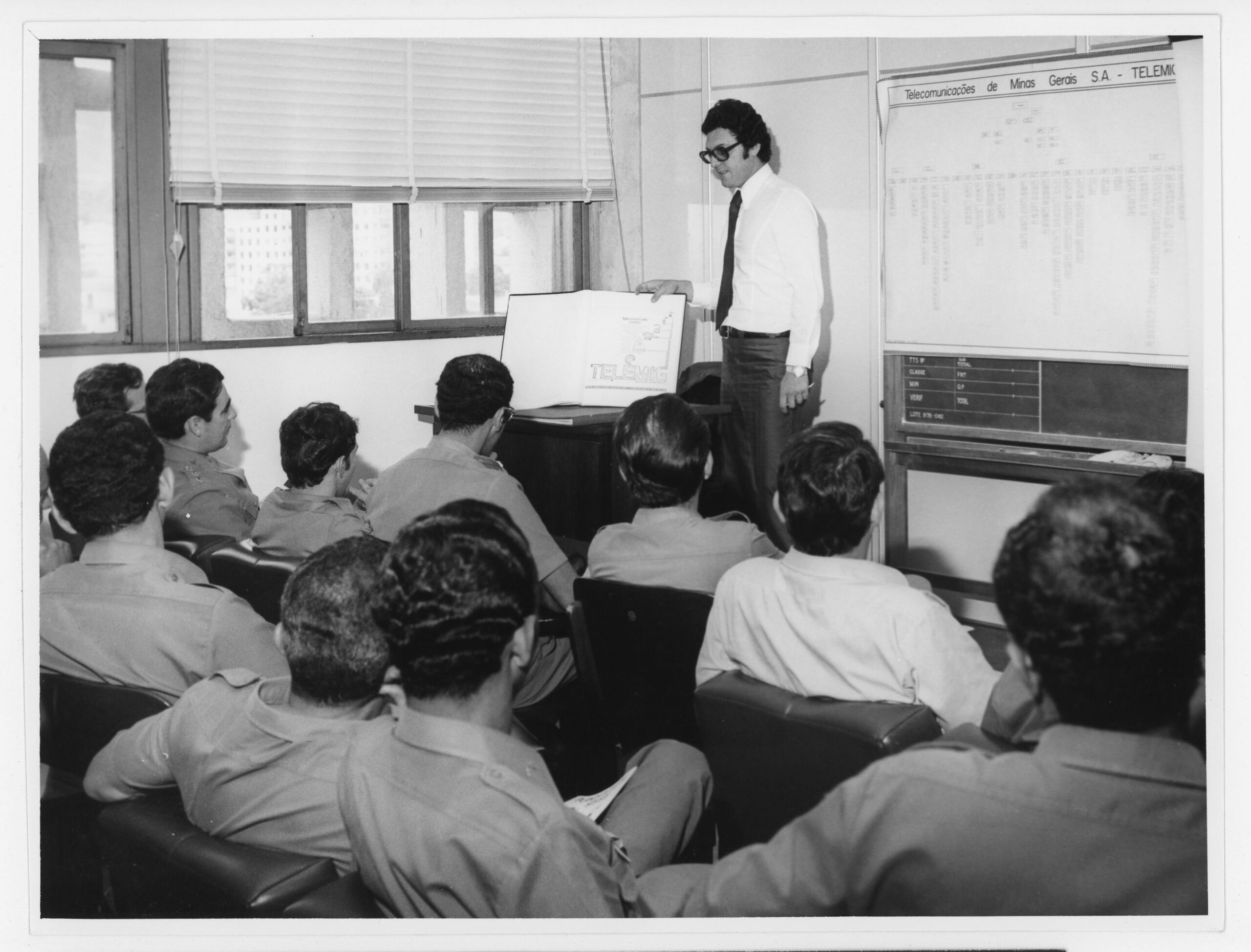 Fotografia em preto e branco de Possível Treinamento. No primeiro plano, vários homens sentados em cadeiras, de costas para o observador. No segundo plano, homem segura e apoia uma pasta sobre uma mesa. Ao fundo, parede, janelas, parede com quadro branco.