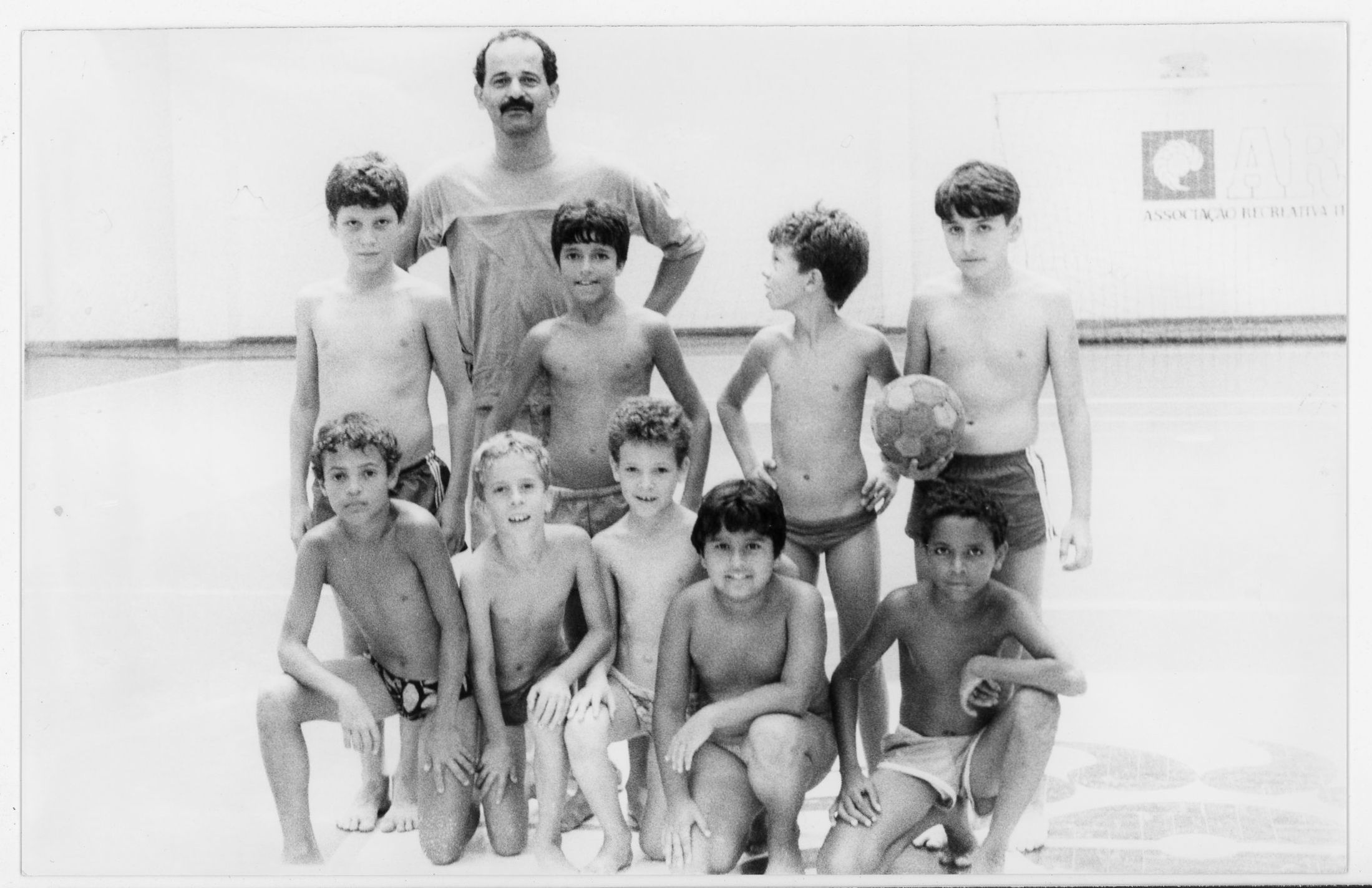 Fotografia em preto e branco, em Minas Gerais. No primeiro plano, crianças abaixadas com roupa de banho posam para a foto. No segundo plano, outras crianças em pé, à direita um menino segura a bola. Atrás deles está o técnico. Ao fundo, à direita vemos um gol, atrás dele na parede o logo da TELEMIG e da ART, Associação Recreativa da Telemig.