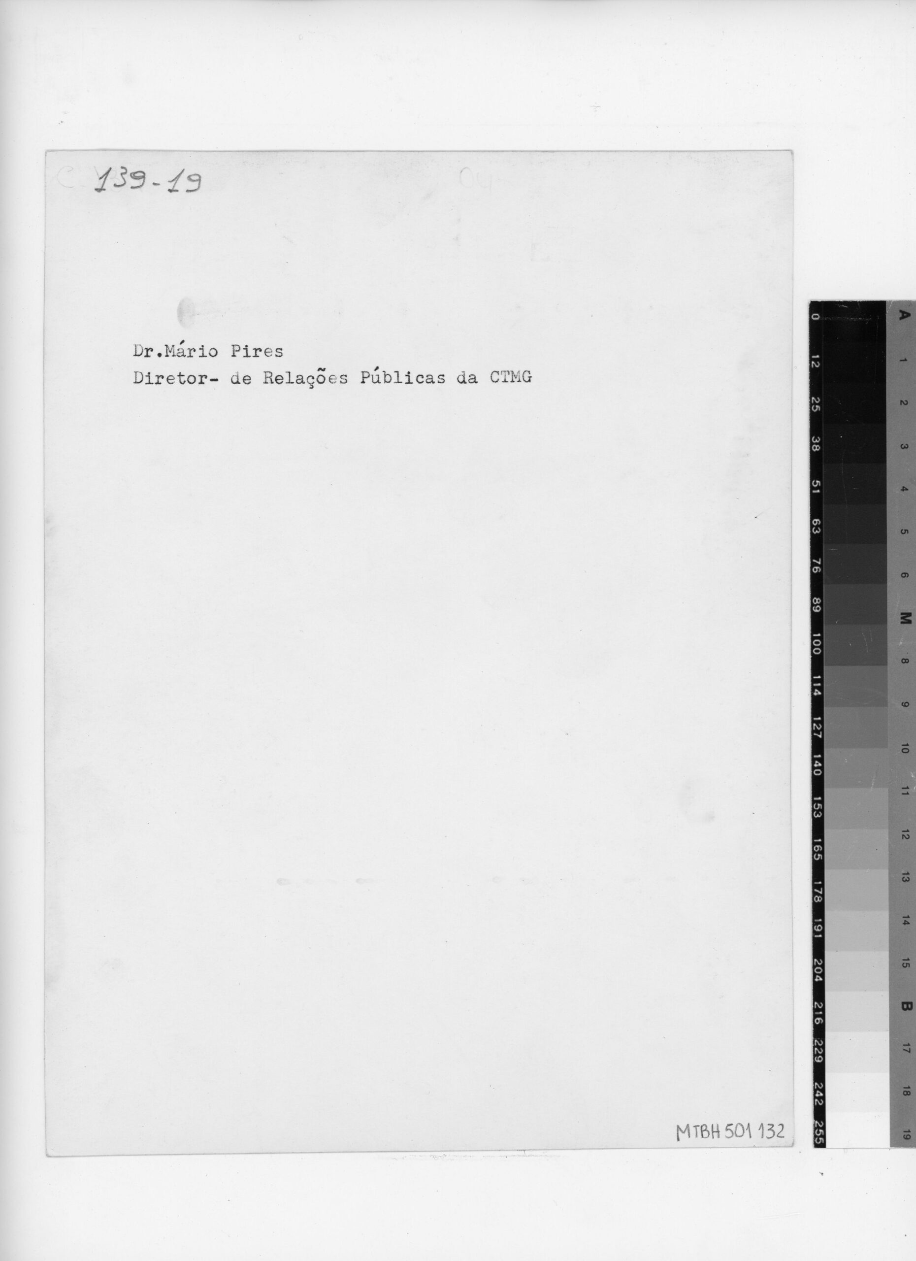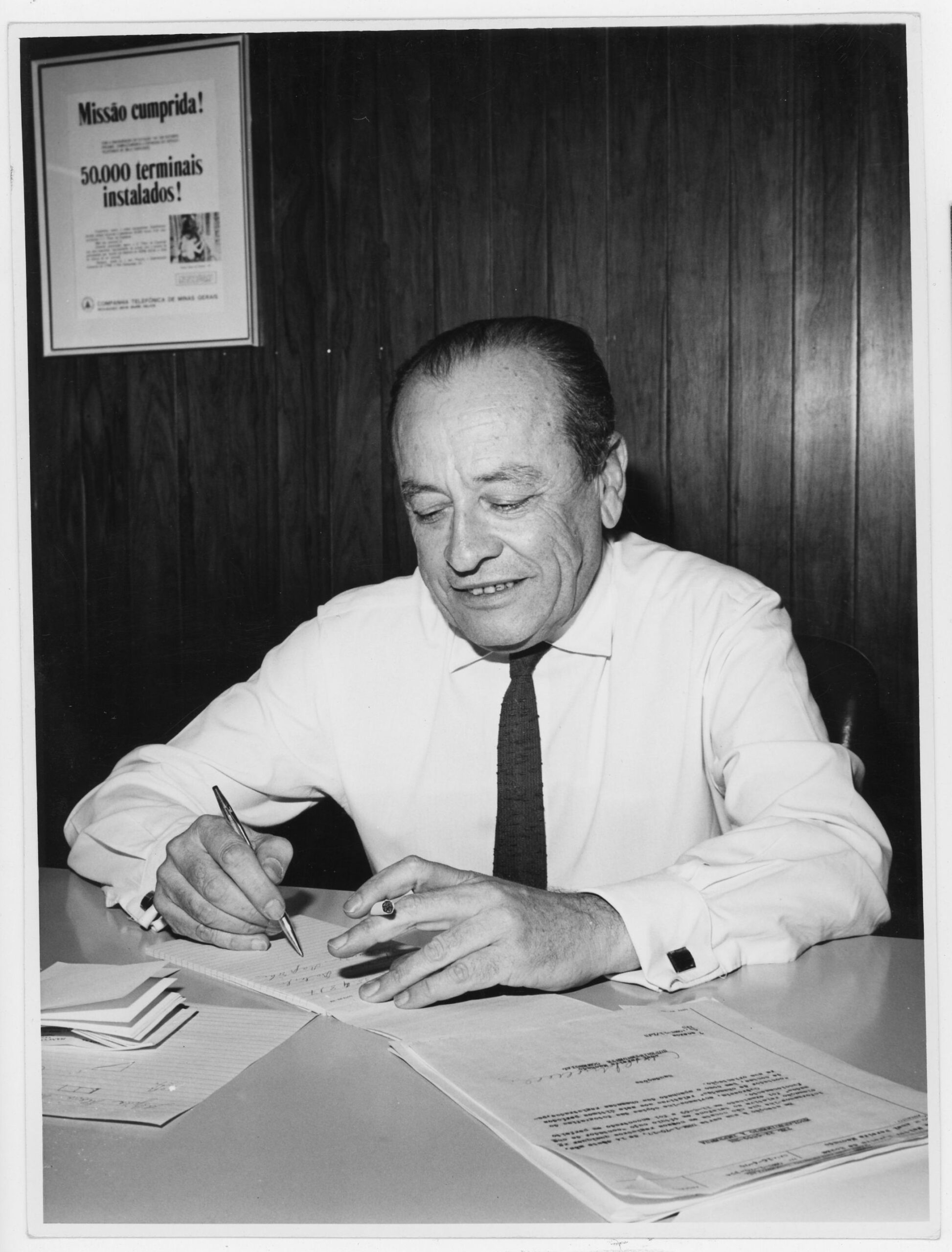 Fotografia em preto e branco, em Minas Gerais. No primeiro plano, o Dr. Mário Pires, diretor de Relações Públicas da CTMG, escreve em um papel sobre a mesa. No segundo plano, à esquerda quadro pendurado na parede.