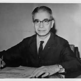 Fotografia em preto e branco, em Minas Gerais. No primeiro plano, o Dr. Luís Carlos de Portilho, de terno e óculos sentado à mesa. Com sua mão esquerda segura uma caneta em cima de um papéis, usa um relógio na mão direita. No segundo plano, à direita vemos parte de um aparelho telefônico, em cima de uma bancada, ao lado uma possível cadeira.