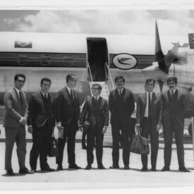 Fotografia em preto e branco, em Minas Gerais. No primeiro plano, grande máquina operada por um funcionário de roupa social, na máquina vemos a inscrição “Kranekar”. No segundo plano, à esquerda rodas grandes de madeira. Ao fundo, à esquerda casa com pilhas de tijolos em frente.