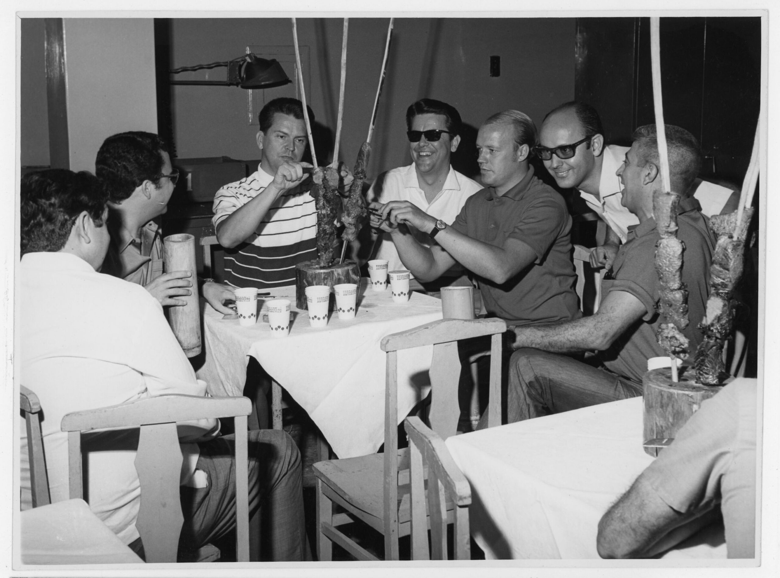 Fotografia em preto e branco, em Minas Gerais. No primeiro plano, à esquerda mesa com duas cadeiras, seguido de uma mesa com um funcionário sentado de costas e um churrasco em cima da mesa. No segundo plano, funcionários sentados ao entorno de uma mesa, em cima dela copos e um churrasco, à direita funcionários cortam pedaços da carne enquanto um funcionário em pé se aproxima para falar algo. Ao fundo, ao centro uma bancada com caixas em cima, e uma luminária presa na parede.