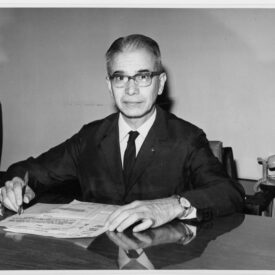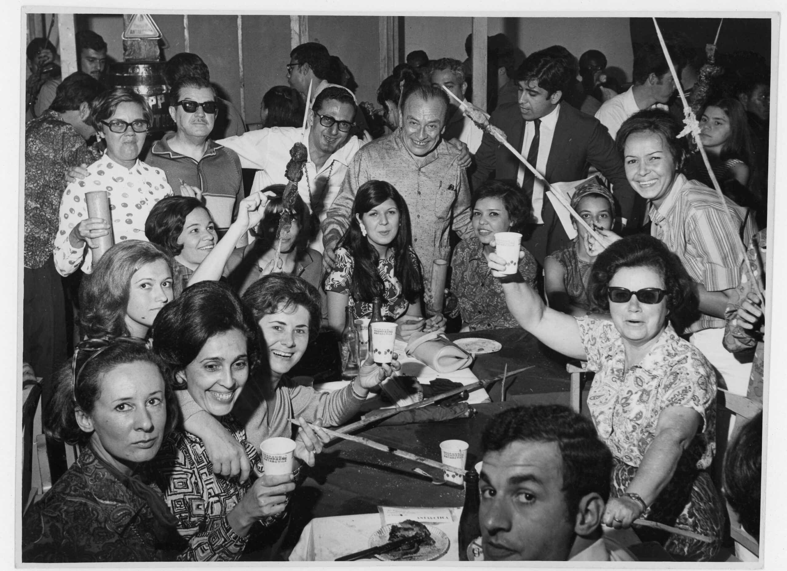 Fotografia em preto e branco, em Minas Gerais. No primeiro plano, à esquerda funcionária sentada a mesa olha para câmera seguida de funcionário que olha para câmera à direita. No segundo plano, à esquerda duas funcionárias abraçadas ao lado delas uma outra levanta o copo, à direita uma funcionária levanta o copo, todas sentadas. Ao fundo, à esquerda funcionárias sentadas, à direita uma funcionária em pé segura um espeto com carne, atrás outros funcionários em pé posando pra foto (entre eles ao centro aparentemente parece o sr. Mário Pires, diretor da CTMG), atrás deles outros conversam entre si.
