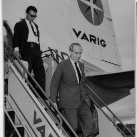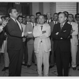 Fotografia em preto e branco em Belo Horizonte, em Minas Gerais. No primeiro plano, grupo de homens e crianças em pé, estando ao centro o jogador Wilson, da Seção de Construções, segurando troféu. Ao lado dele, Geraldo Gomes da Silva, diretor da CTMG. No segundo plano, à esquerda, homens em pé. À direita, pessoas em pé em parte elevada, sendo possivelmente uma arquibancada. Ao fundo, parede.