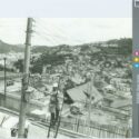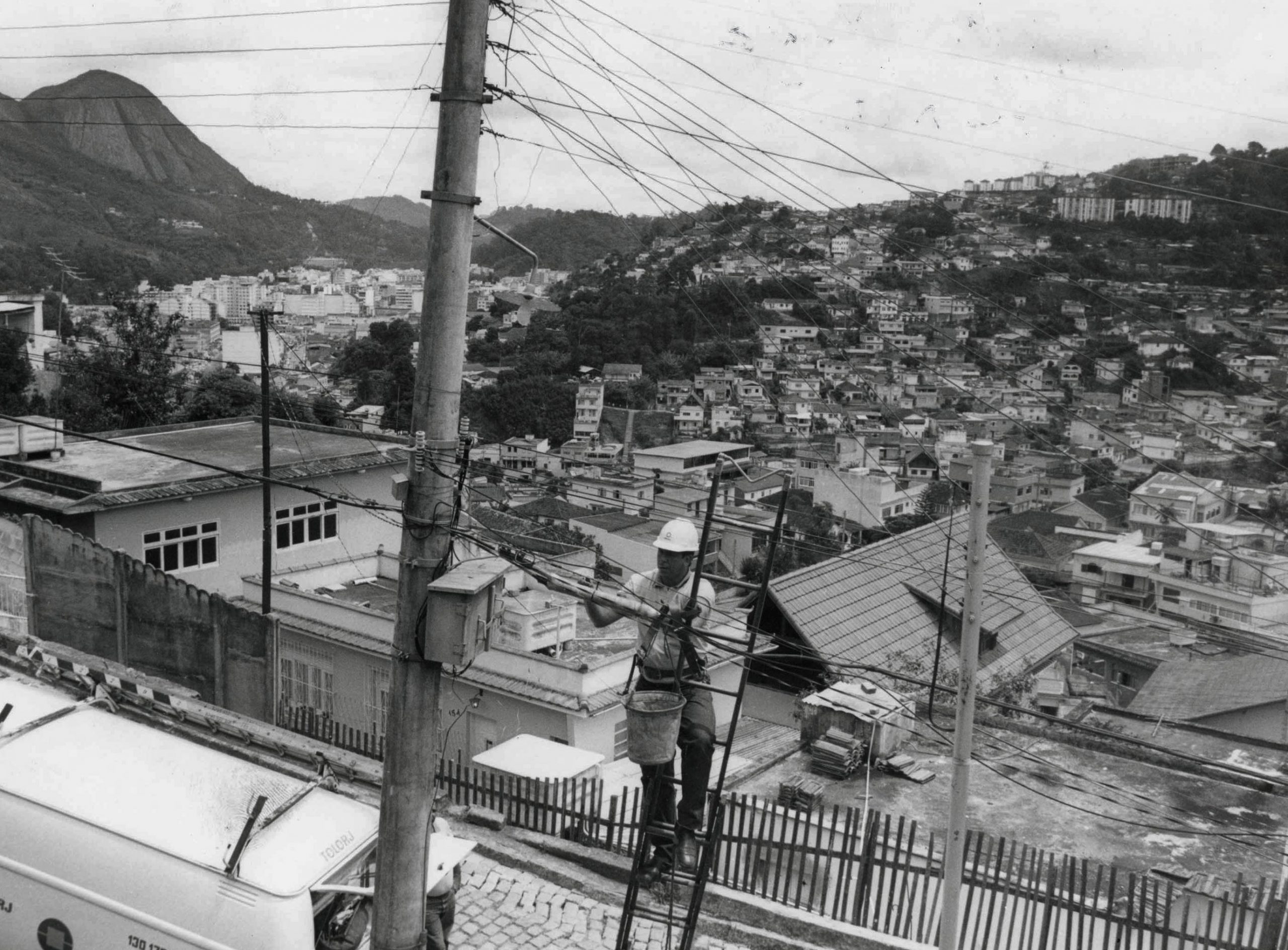 Fotografia em preto e branco. No primeiro plano, funcionário Jairo Jolly trabalhando sobre escada apoiada em fios junto a poste, na instalação/ manutenção da rede aérea nem Nova Friburgo. Ao fundo, paisagem urbana, com casas e árvores.