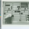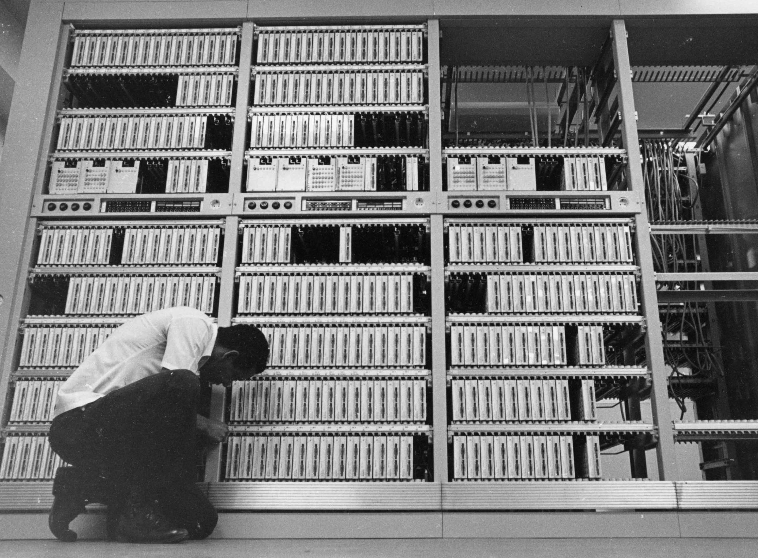 Fotografia em preto e branco. No primeiro plano, no lado esquerdo, funcionário agachado. No segundo plano, central telefônica.