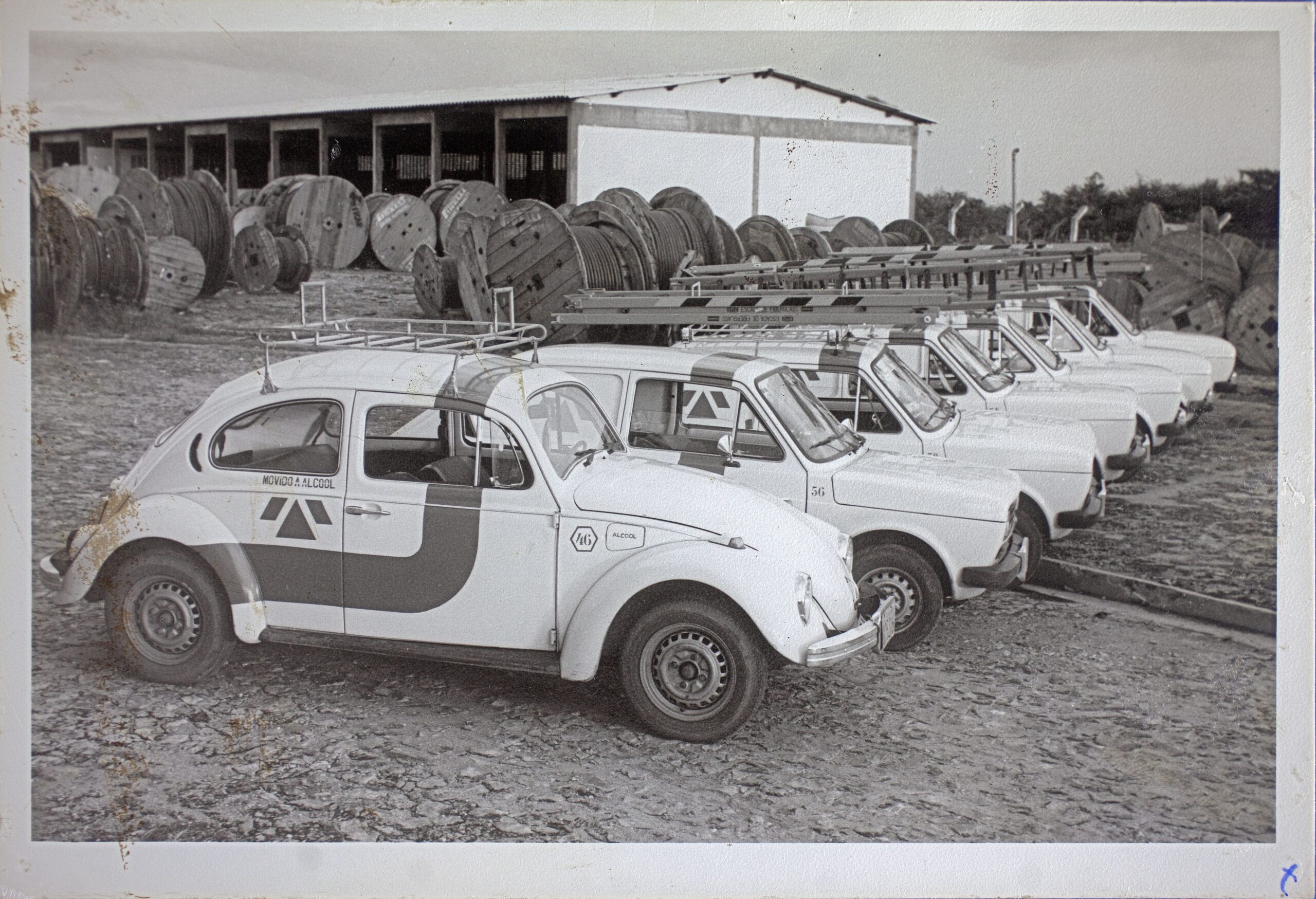 Fotografia em preto e branco colada na lateral direita de folha de álbum de fotografias “Solenidade de Inauguração DDD-DDI – Em Teresina”. A fotografia apresenta, em primeiro plano, sequência de carros da Telepisa estacionados lado a lado, alguns com escadas em cima. Em segundo plano, carretéis de madeira com cabos enrolados. Ao fundo, galpão e árvores.