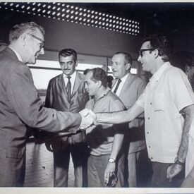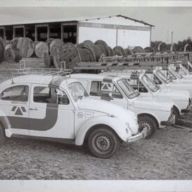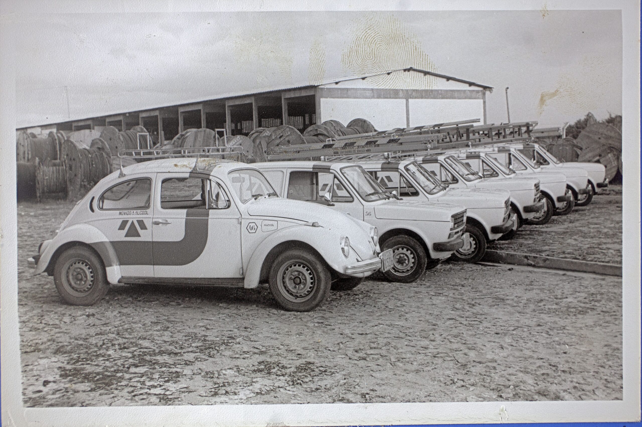 Fotografia em preto e branco colada na lateral direita de folha de álbum de fotografias “Solenidade de Inauguração DDD-DDI – Em Teresina”. A fotografia apresenta, em primeiro plano, sequência de carros da Telepisa estacionados lado a lado, alguns com escadas em cima. Em segundo plano, carretéis de madeira com cabos enrolados. Ao fundo, galpão.