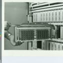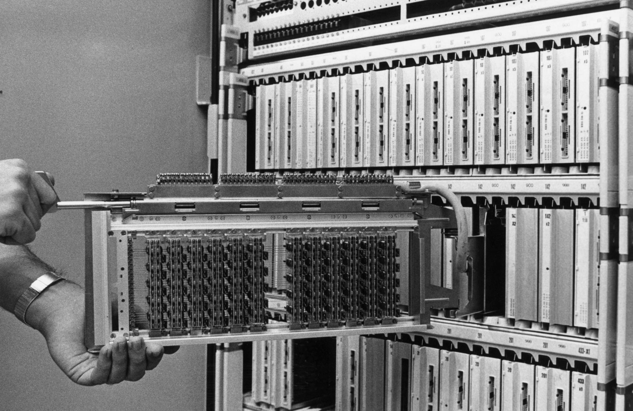 Fotografia em preto e branco. No primeiro plano, mãos de possível funcionário segurando peça que faz parte de equipamento e está encaixada no mesmo.
