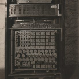 Fotografia em preto e branco, na Rua da Carioca, no Centro do Rio de Janeiro. No primeiro plano, no lado esquerdo, par de edifícios, calçada com árvores e postes, ao centro, carro estacionado no lado esquerdo, homem de bicicleta e bondinho, no lado direito, pessoas na rua, próximas à calçada, pessoas na calçada, com árvores e postes, e edifícios. Ao fundo, edifícios.