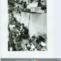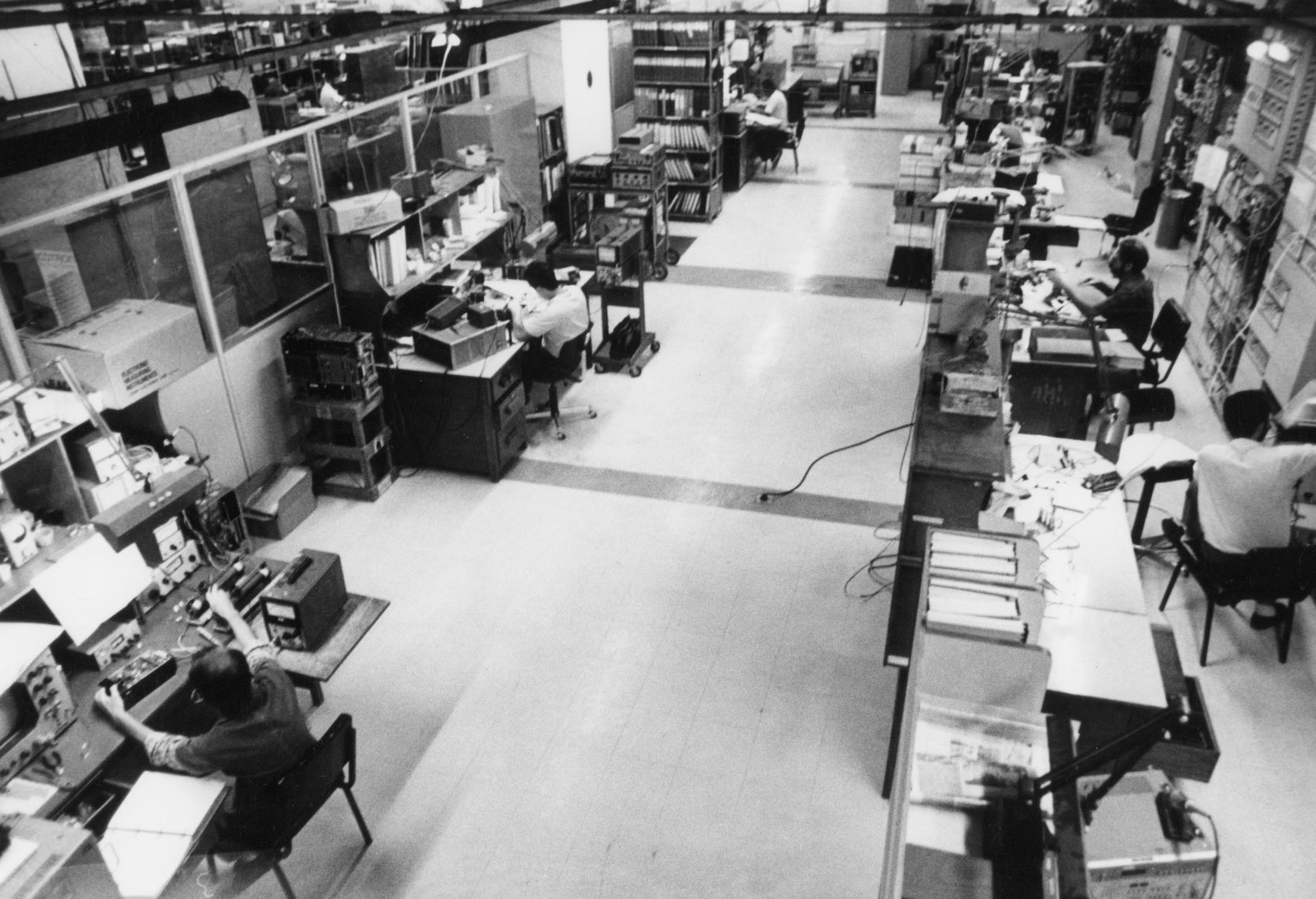 Fotografia em preto e branco. Ambiente de trabalho (centro de reparos) possuindo, nas laterais, equipamentos e mesas com funcionários sentados de frente trabalhando. Ao centro, corredor.