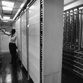 Fotografia em preto e branco. No primeiro plano, do lado esquerdo para o direito, possível funcionário de pé com óculos de proteção, de frente para equipamento, trabalhando no mesmo.