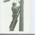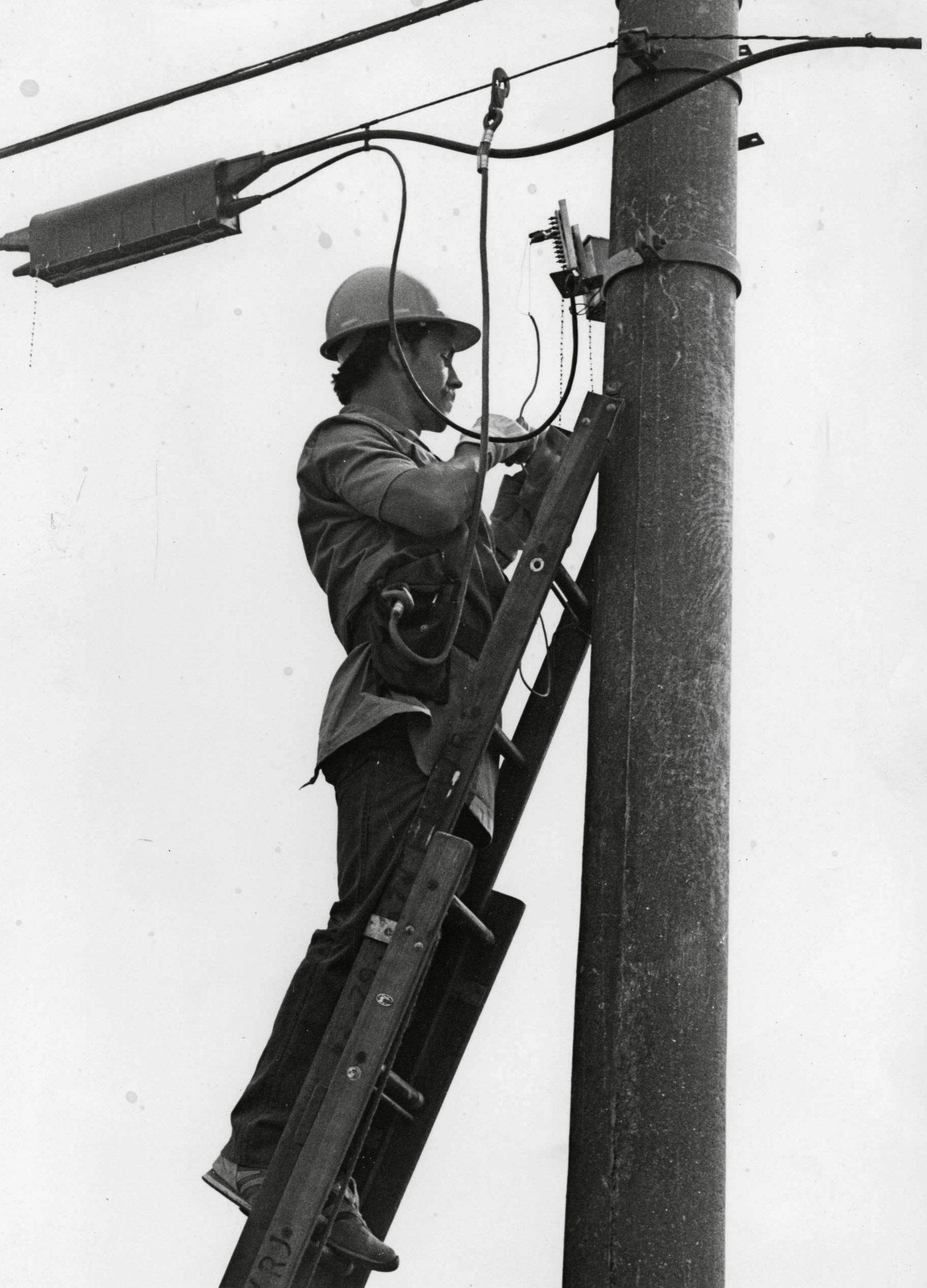 Fotografia em preto e branco. No primeiro plano, funcionário de pé em cima de escada erguida apoiada no poste à sua frente, trabalhando no mesmo. Ao fundo, céu.