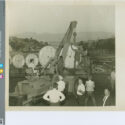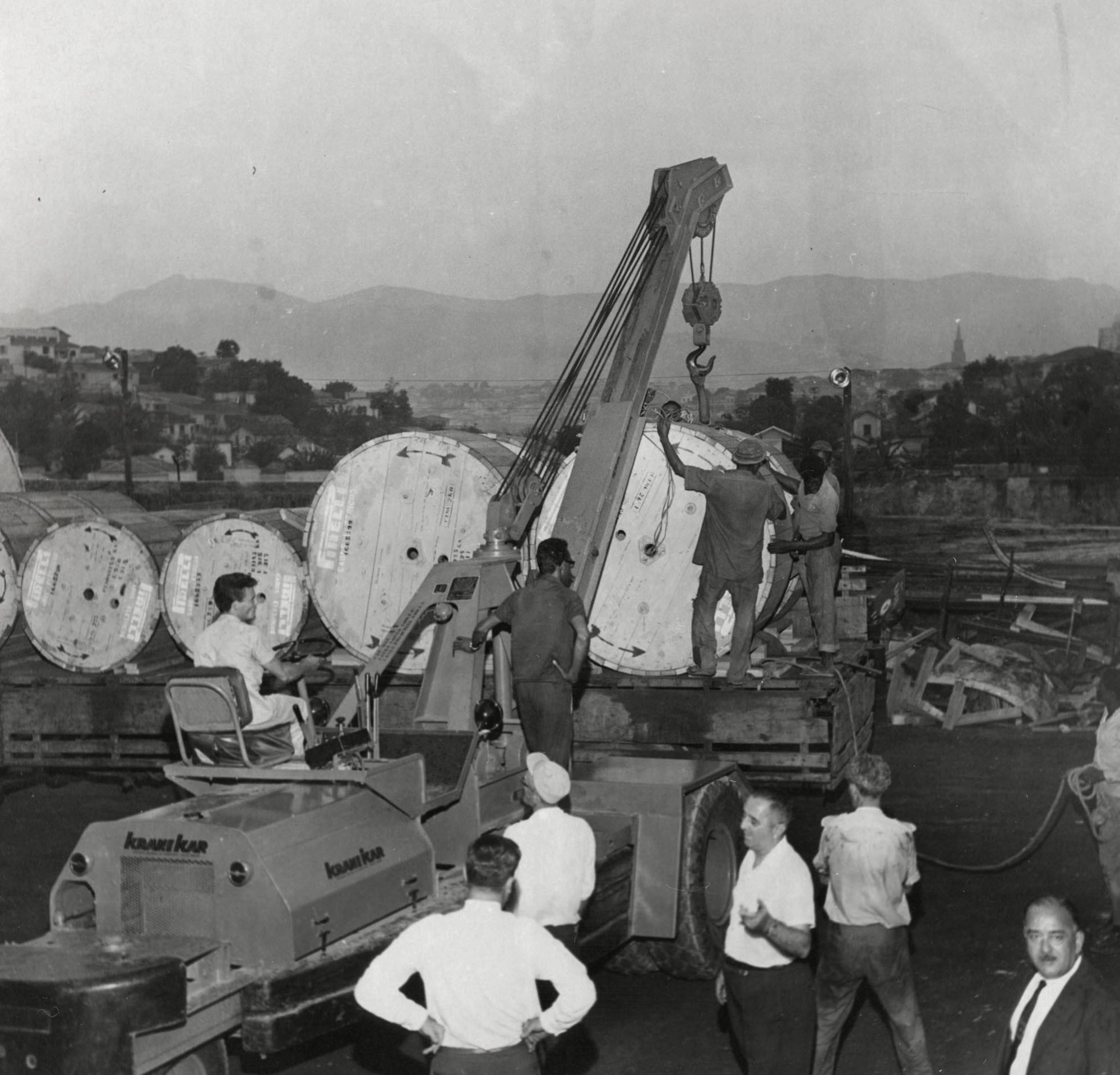 Fotografia em preto e branco. No primeiro plano, espécie de guincho que aloca equipamentos em um caminhão, tendo ao redor vários funcionários. Ao fundo, paisagem.