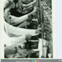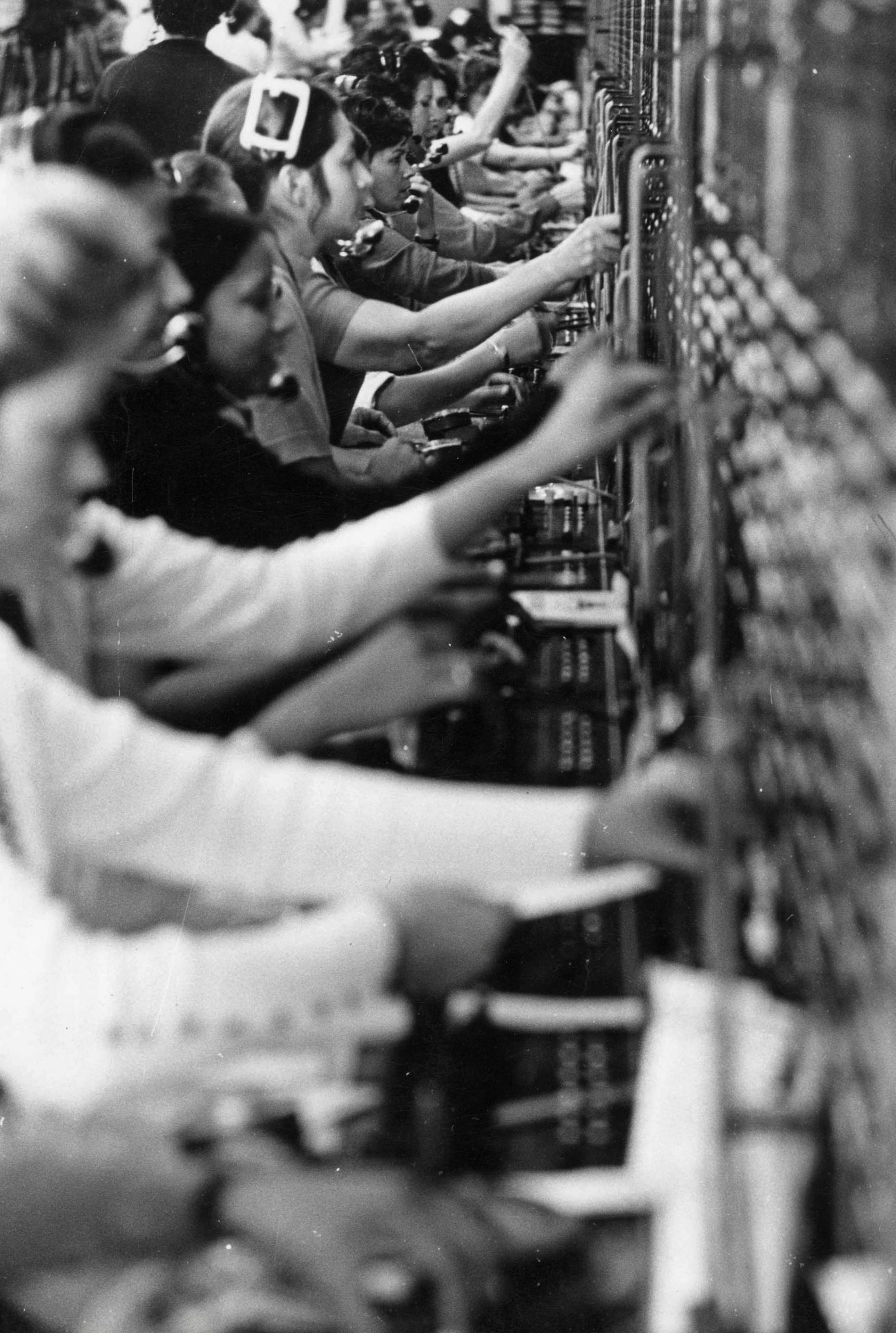 Fotografia em preto e branco. Imagem de telefonistas sentadas em fileira à esquerda, de frente para mesas telefônicas à direita. As telefonistas estão utilizando fones em arco e manuseando peças das mesas.