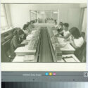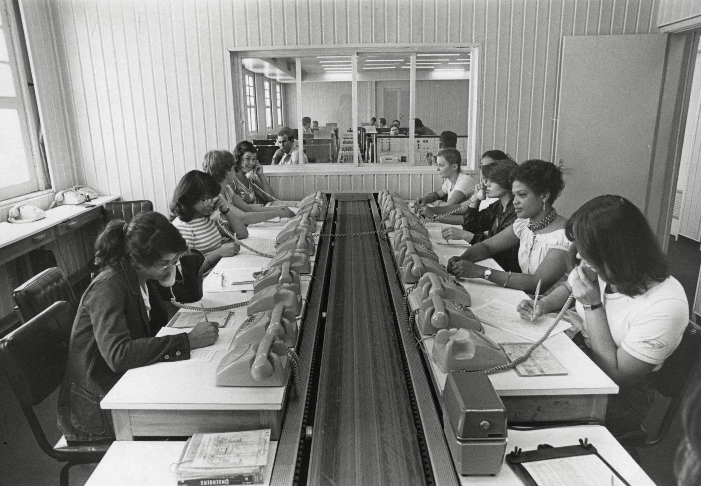 Fotografia em preto e branco. Imagem de sala de Central de Ocorrências da Polícia Militar (PM) com mesa ao centro contendo telefones de disco em cima e funcionárias sentadas ao redor, à esquerda e à direita. As funcionárias estão utilizando os telefones, trabalhando no atendimento. Ao fundo da sala, parede com janela para outro ambiente, com outros funcionários trabalhando.