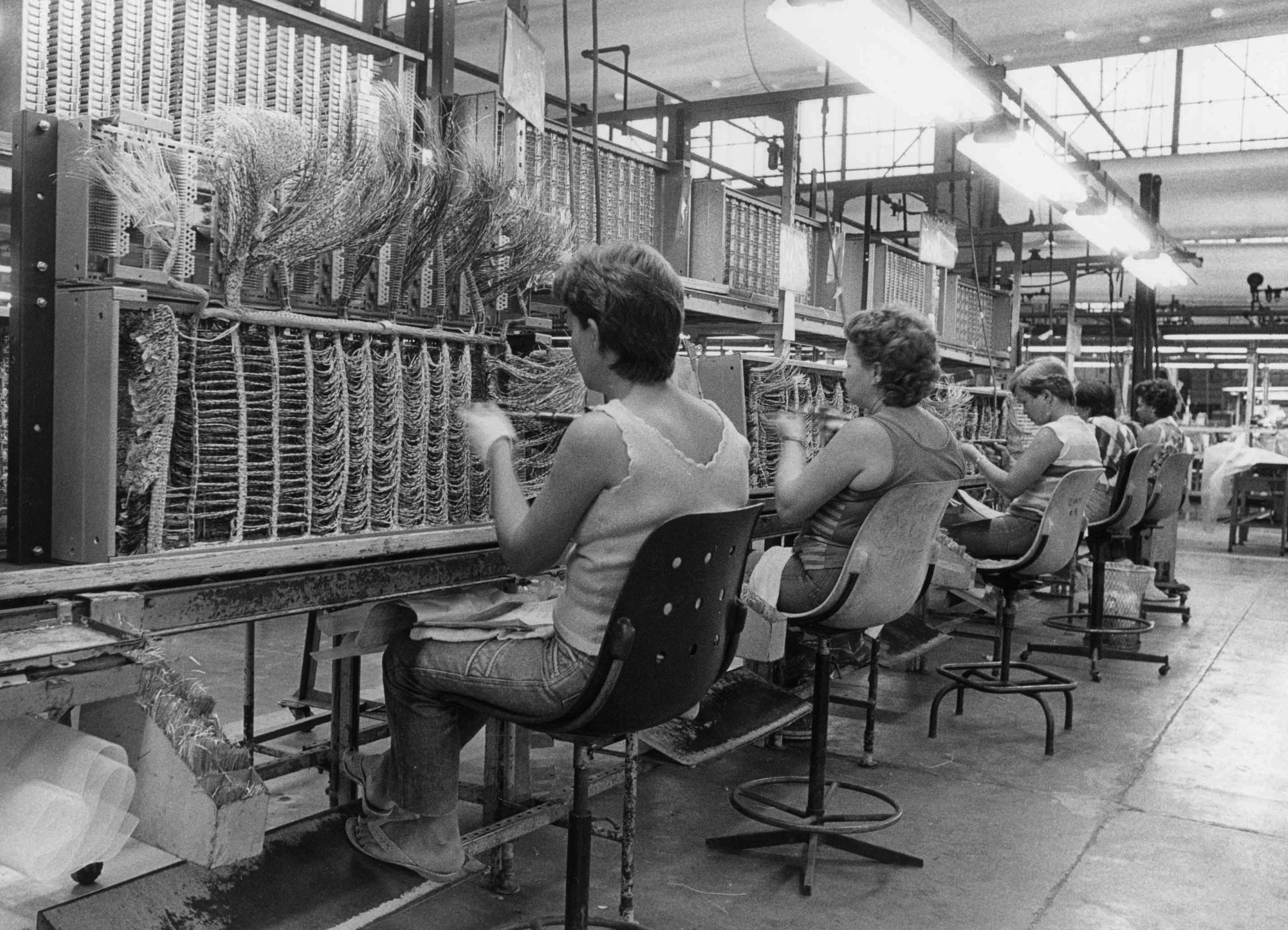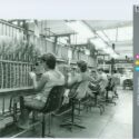 Fotografia em preto e branco. Imagem do galpão da fábrica da Standard Eletric com bancada à esquerda contendo quadro das centrais Pentaconta de comutação eletromecânicas em cima. À direita, de frente para a bancada, funcionárias sentadas trabalhando na montagem do equipamento.