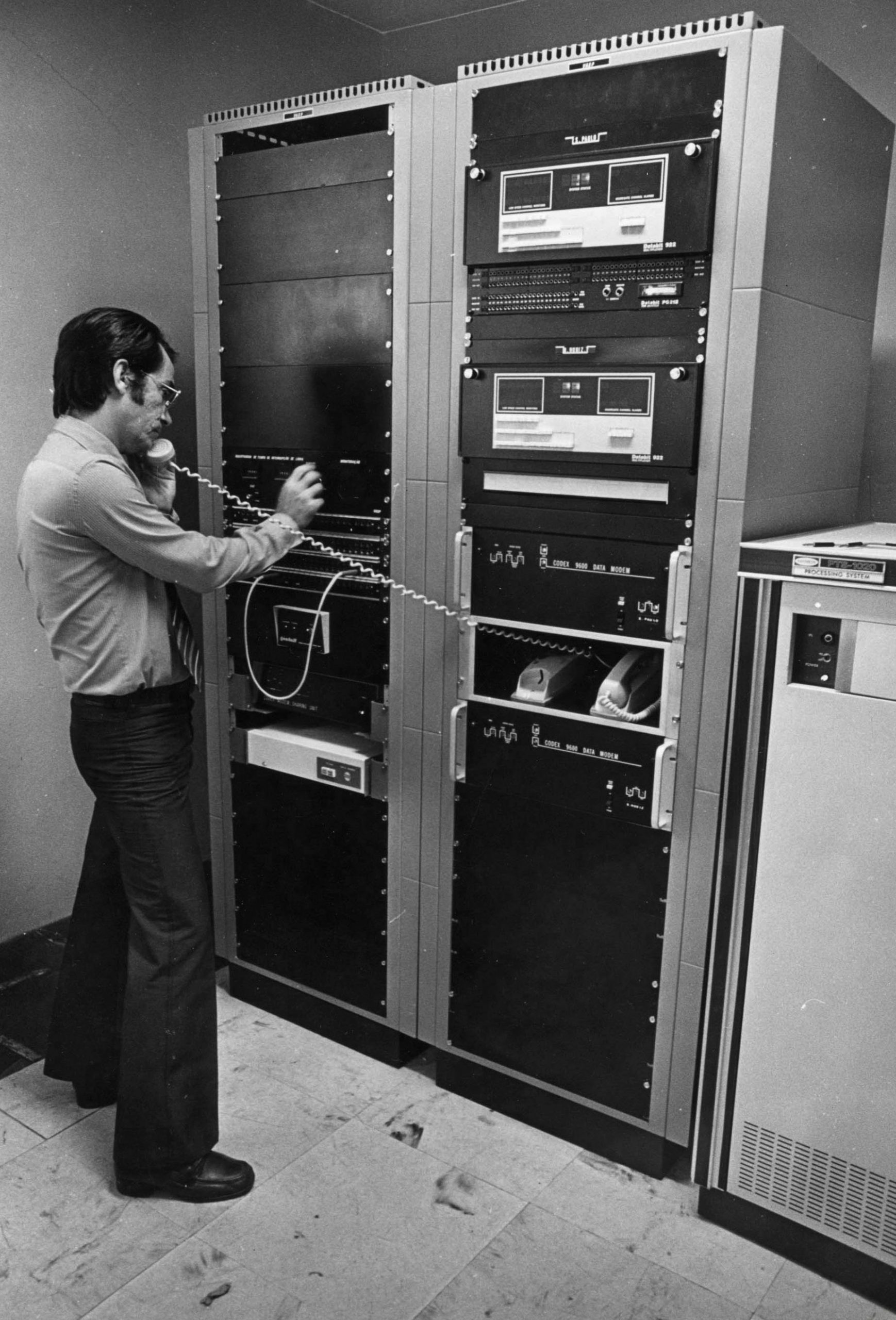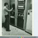 Fotografia em preto e branco. Em primeiro plano, funcionário em pé à esquerda, de frente para equipamento vertical de possível central telefônica. O homem está utilizando monofone saído de aparelho do equipamento. Ao fundo, parede.