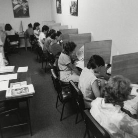 Fotografia em preto e branco, em Itaboraí, no Rio de Janeiro. No primeiro plano, ao centro, mesa com funções, tendo acima dela, livro, dois telefones e papéis, à frente, funcionário de pé utilizando um dos telefones. Ao fundo, no centro, janela, no lado direito, funcionário de pé.