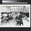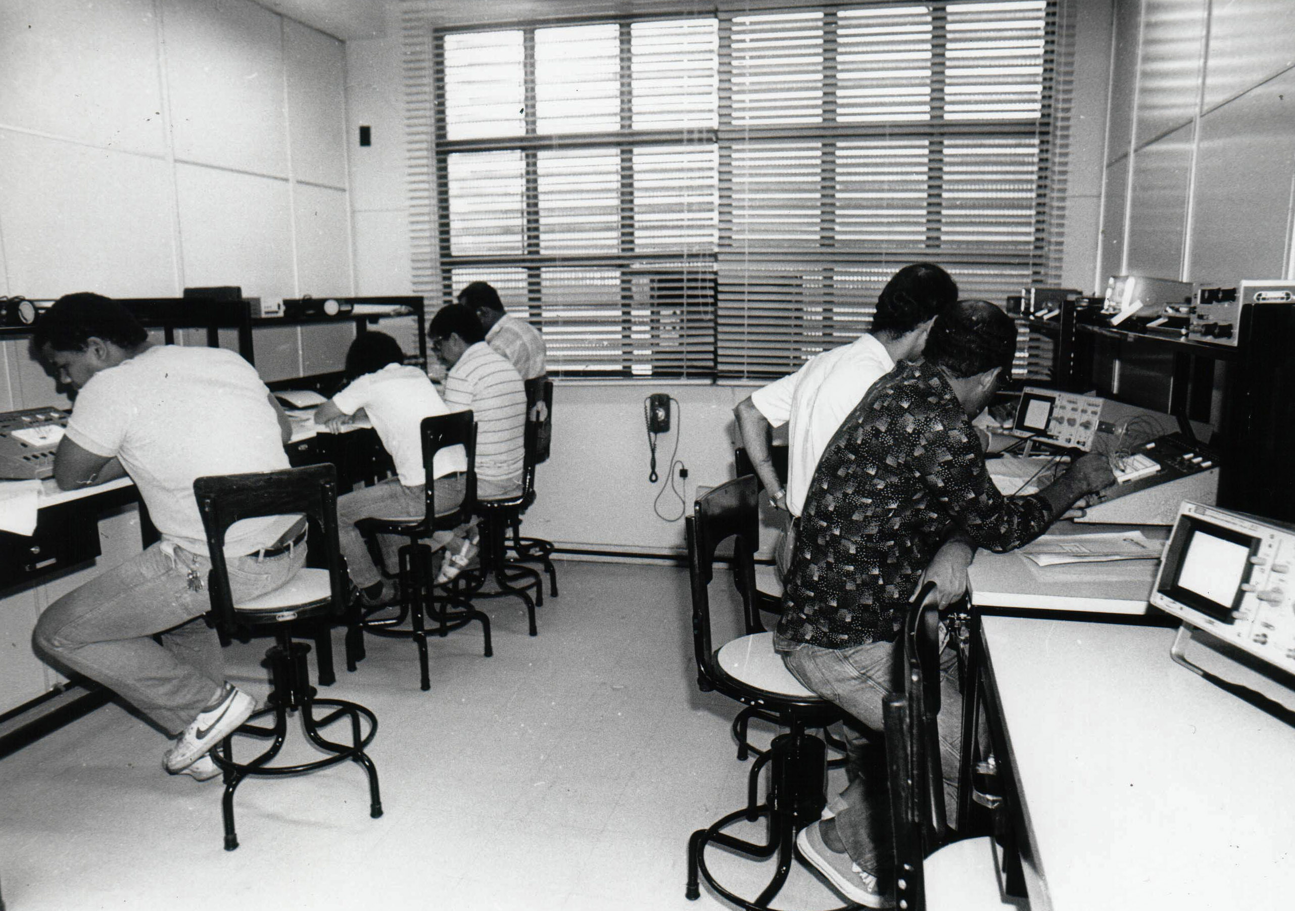Fotografia em preto e branco. Imagem de sala com mesas encostadas nas paredes laterais e possíveis técnicos sentados em frente, participando de curso sobre equipamentos. Ao fundo, parede com janela contendo persiana.