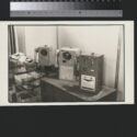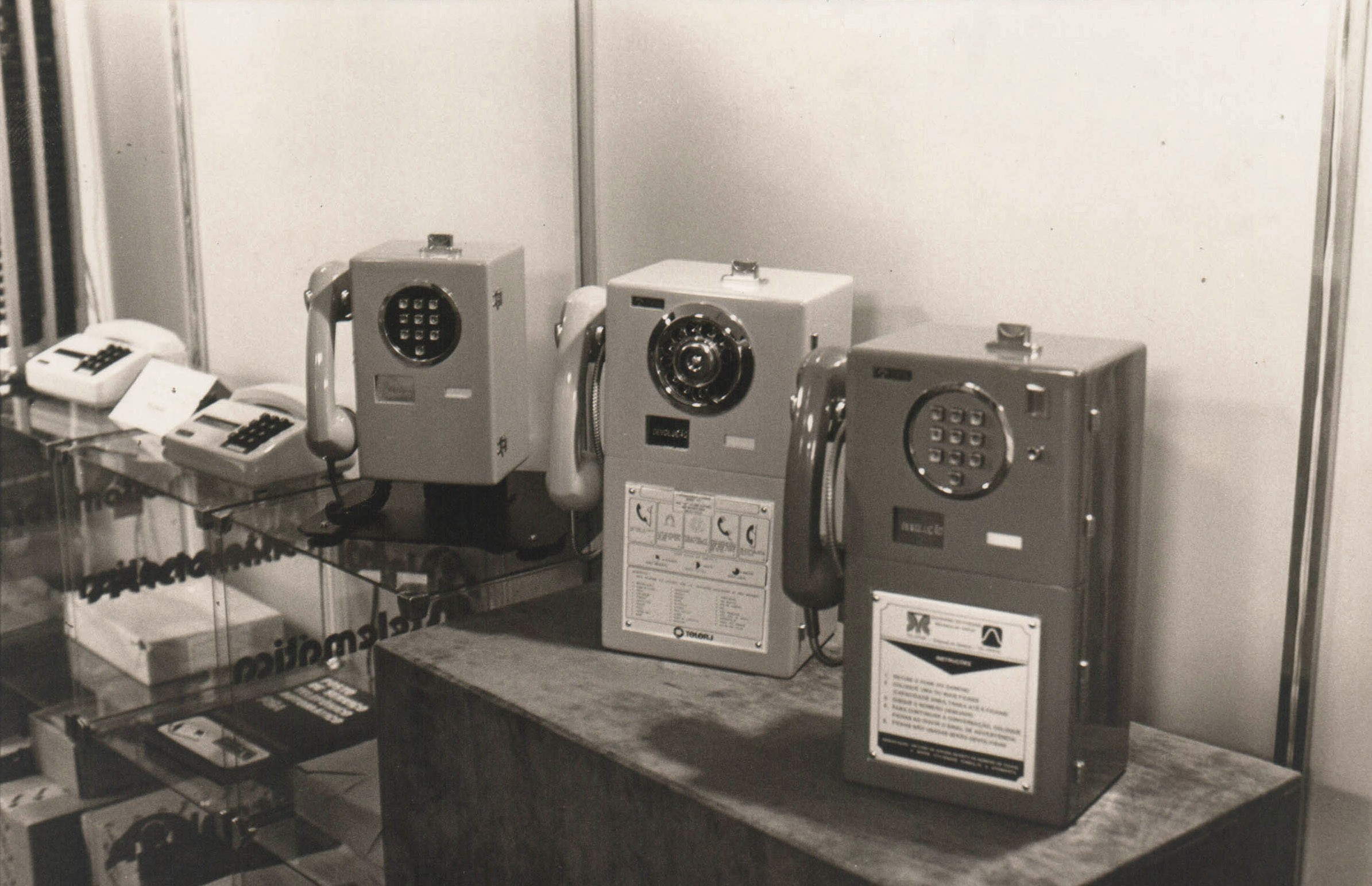 Fotografia em preto e branco. Em primeiro plano, à direita, dois telefones públicos em cima de suporte de madeira, sendo um de disco e o outro de teclas. Em segundo plano, à esquerda, vitrine de vidro com dois telefones de mesa e um telefone público em cima, todos de teclas. Ao fundo, parede.