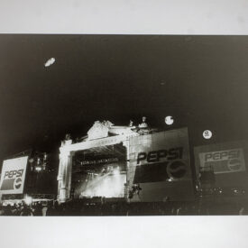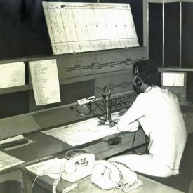 Fotografia em preto e branco. No primeiro plano, homem manipulando grande equipamento.