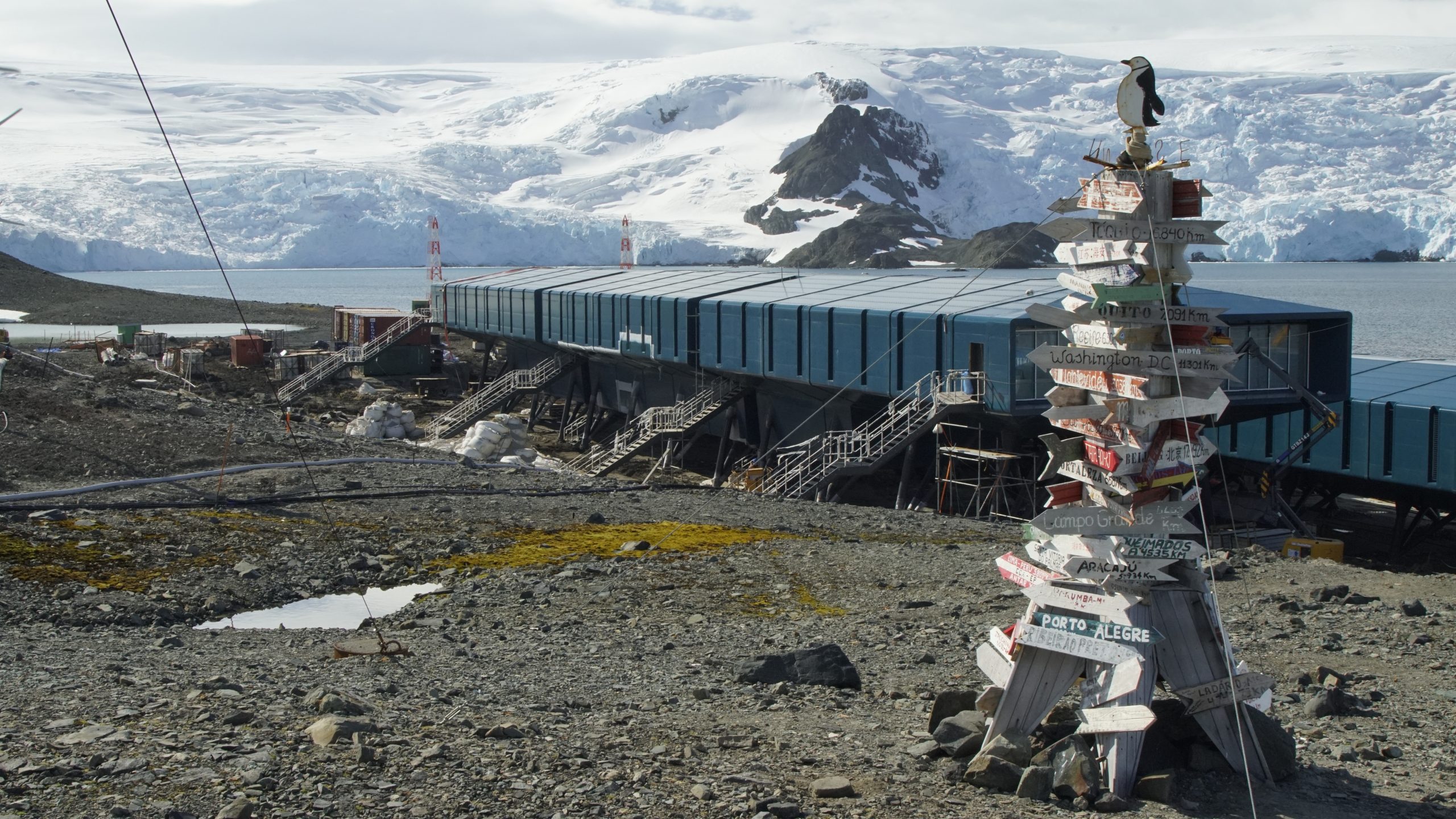 A estação Antártica Comandante Ferras (EACF) é uma base Antártica Brasileira, responsável por diversos programas de pesquisas climatológicas. Desde 2005 a Oi atua na comunicação desta base com o solo brasileiro. Em 2019, 8 anos após o incêndio que destruiu a primeira EACF, a Oi lançou uma nova infraestrutura de telefonia móvel através de rede 4G. Ela foi um marco na história da Estação, pois facilita o contato dos pesquisadores com o Brasil e permite a rápida transmissão dos dados das pesquisas. Em Janeiro de 2020 a Estação foi oficialmente inaugurada. Na imagem, placas indicando as direções e distância de países e de cidades brasileiras.