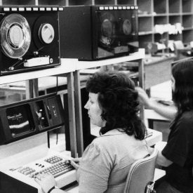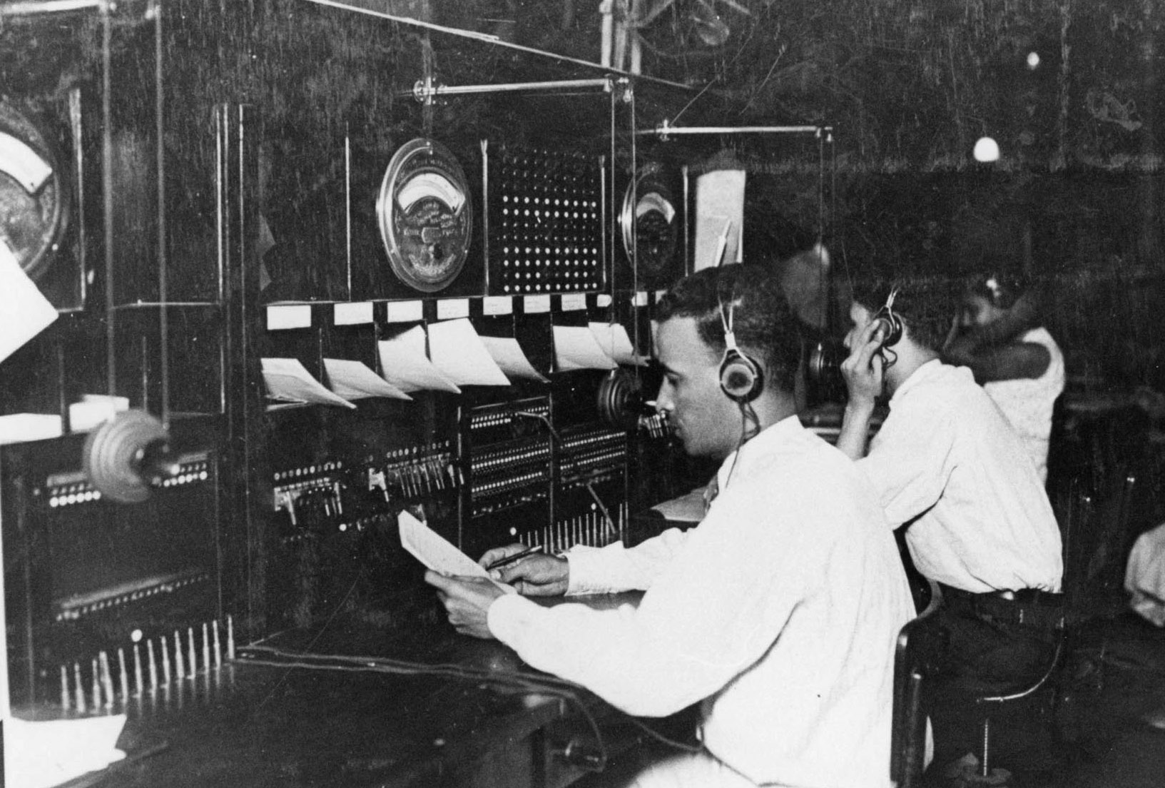Reprodução de fotografia em preto e branco. Em primeiro plano, funcionário sentado em frente à mesa de operações, utilizando fone em arco e segurando papéis. Em segundo plano, funcionário sentado em frente à mesa de operações, utilizando fone em arco. Ao fundo, funcionária sentada utilizando fone em arco.