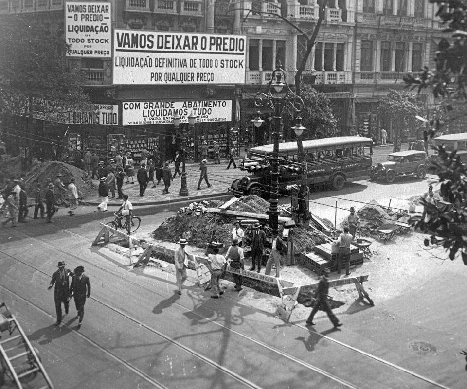 Fotografia em preto e branco. No primeiro plano, à esquerda, dois homens caminhando no meio da rua, por onde passam trilhos de bondes. Ao centro, obra da Companhia Telephônica Brasileira, com escavação, placas de barreira ao trânsito, montante de terra, tijolos, oito funcionários e poste de iluminação pública. Ao fundo, ônibus, carro, prédios comerciais com outdoor sobre liquidação e pedestres, junto a outro trecho da obra.