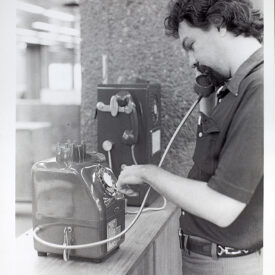 Fotografia em preto e branco. Em primeiro plano, à esquerda, homem em pé em parte elevada. Em segundo plano, três orelhões presos à mesma haste, com pessoas utilizando os mesmos e pessoas em pé ao redor. Atrás, carro do modelo Fusca. Ao fundo, veículos, pedestres, árvores e fachadas de estabelecimentos comerciais.
