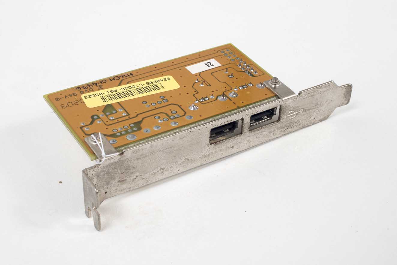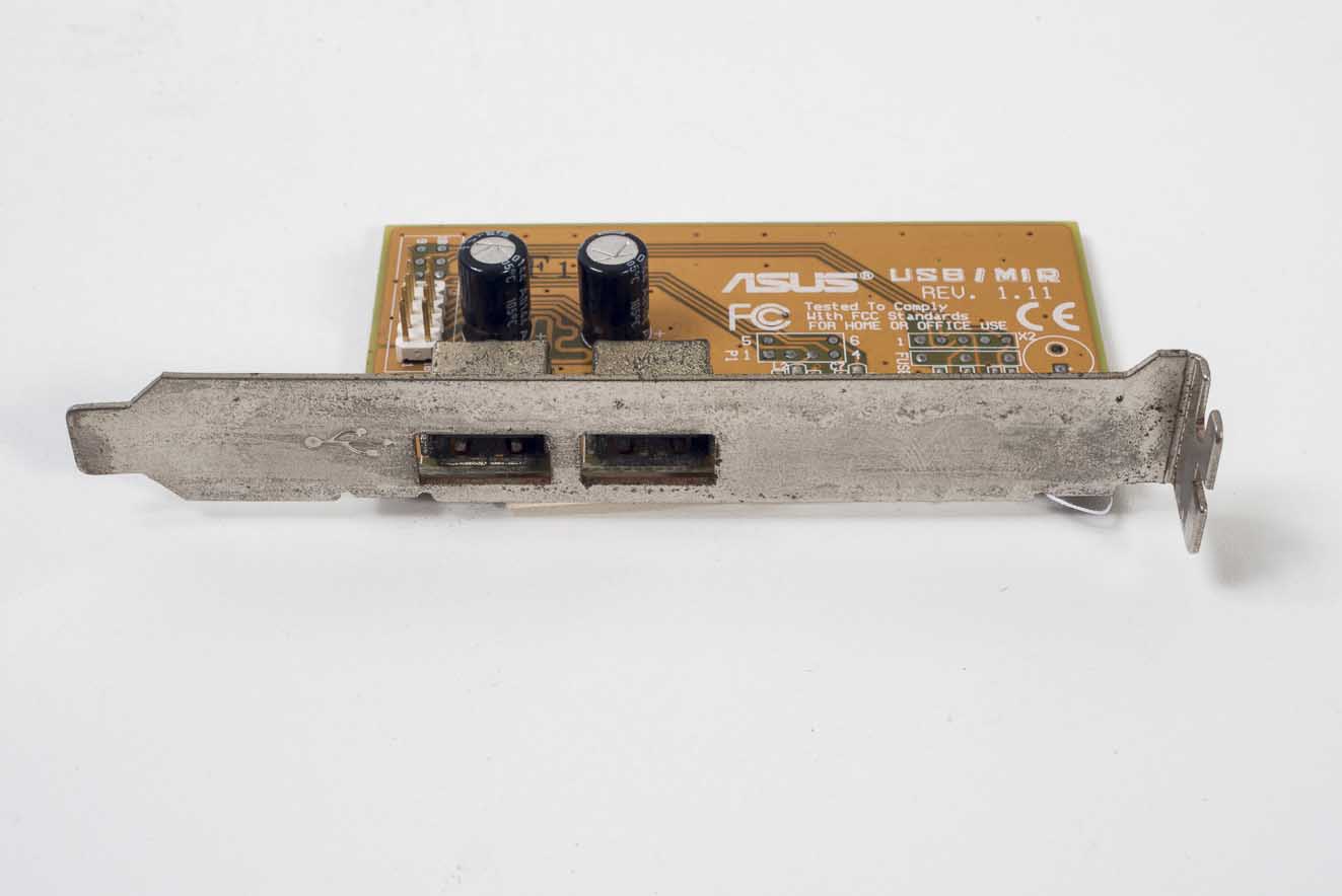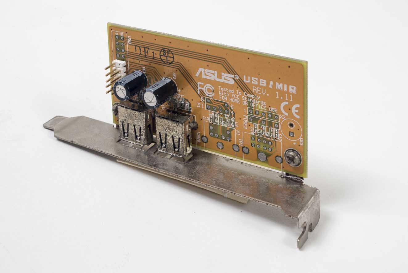 Placa USB 2 portas em metal e plástico, em formato irregular nas cores prata e laranja. Na parte frontal placa de metal irregular, tendo na extremidade direita finalização em dobra para a frente, na área central duas conexões USB de metal plástico. Na parte superior placa retangular na cor laranja com diversos conectores e plugs em metal, dentre os quais dois cilindricos de metal revestidos de plástico preto com inscrições técnicas prósimo a lateral esquerda, placa de plástico branco com nove retângulos dourados encaixados, dois parafusos junto a margem inferior. Inscrições na área central da placa. Na parte inferior pinos e semi- esferas de metal em relevo por toda extensão da placa e duas etiquetas com informações técnicas.