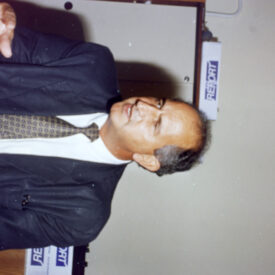 Projetor de slide em formato semelhante ao de um prisma retangular com tubo na frente, feito em metal na cor cinza. Parte frontal possui tubo na cor cinza e lente do tipo objetiva e rosqueável, utilizada para projetar a imagem. Ao redor da lente, inscrição "NITTO PROJECTION LENS F=13CM 1:2.8" na cor preta e "ELMO" na cor vermelha. Na lateral esquerda, cinco frisos em alto relevo à esquerda. À direita, placa no formato retangular e em metal com as inscrições "ELMO", encava e na cor vermelha, e "ELMOSLIDE-51 / N°14737 / MADE IN JAPAN / PATENT N°380824", em relevo na cor preta. Abaixo, botão circular na cor cinza para regulagem da altura do projetor. Parte posterior apresenta, no canto inferior esquerdo, saída do cabo liso na cor cinza terminado em tomada de dois pinos. O cabo possui caixa no formato retangular e na cor cinza com interruptor com as cores vermelha e branca, para acender/desligar a lâmpada. Na lateral direita, duas placas em metal à esquerda. A primeira é em formato circular e possui símbolo e inscrição em japonês. A segunda, em formato retangular, possui a inscrição "120V AC & DC/ LAMP MAX. 300W". À direita, cinco frisos em alto relevo. Parte superior do aparelho possui cavidade no formato quadrangular, onde se encontra a lâmpada do projetor. Abaixo, cinco respiradouros em formato retangular e abertura que separa o corpo do projetor do tubo da lente. Base possui quatro pés de borracha, sendo os dois primeiros de altura regulável. Ao centro, suporte em plástico para saída do cabo que liga às linhas de força.