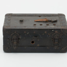 Peça em formato retangular de madeira com porta de vidro que se abre através de dobradiças. No seu interior possui engrenagens de metal dourado e plástico. Na parte de cima, contém caixa com as inscrições "101 AHH 63/2 / 1UF/ 250V DC WKG/TS 1". Abaixo, interruptor com duas posições "ADIANTAR" e " ATRASAR". Na parte inferior , placa com as inscrições "GENT/OF LEICESTER". Na lateral esquerda da caixa, fechadura losangular de metal. Acompanha duas chaves (IPO 253-1 e IPO 253-2).