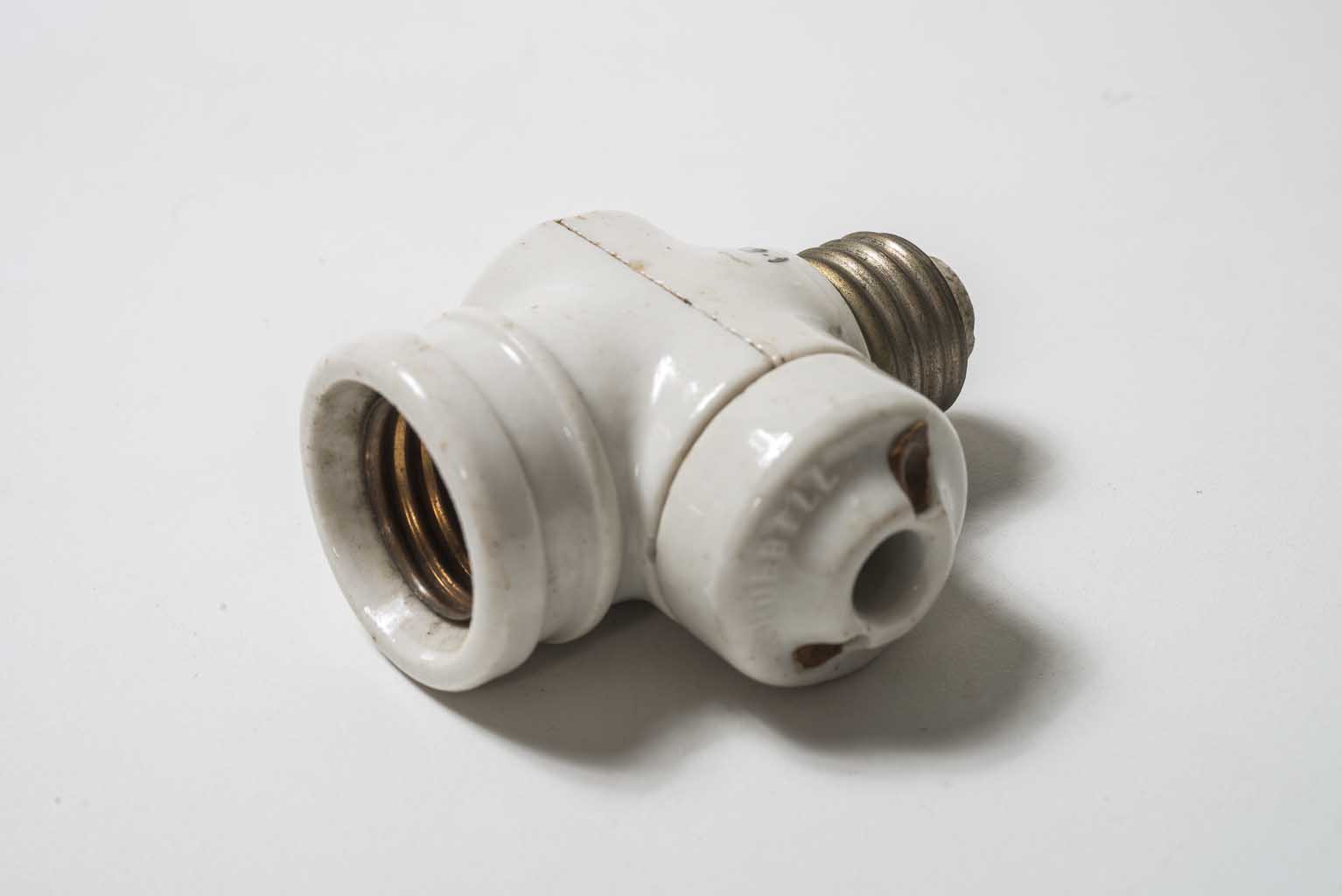 Soquete de cerâmica em formato irregular, na cor branca. A peça é formada por duas partes levemente cilíndricas, sendo uma na horizontal e outra na vertical. A parte vertical possui, na parte superior, bocal em metal dourado rosqueável para encaixe da lâmpada e, na parte inferior, peça rosqueada em metal dourado, tendo, na extremidade, contato em metal. A parte horizontal possui, de um lado, duas cavidades e do outro lado, peça circular com abertura ao centro e ladeada por duas aberturas encava e inscrição do fabricante.