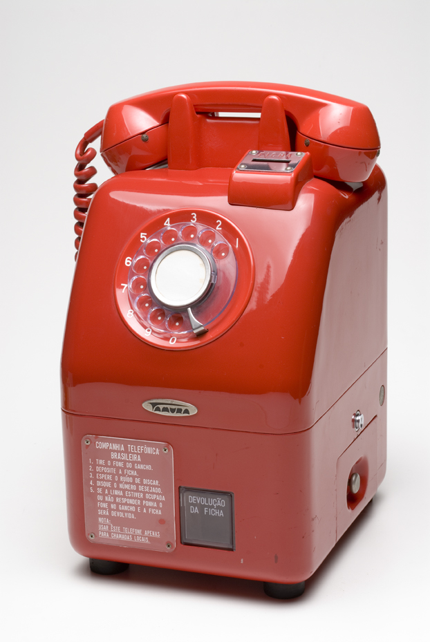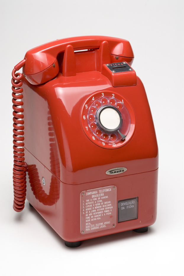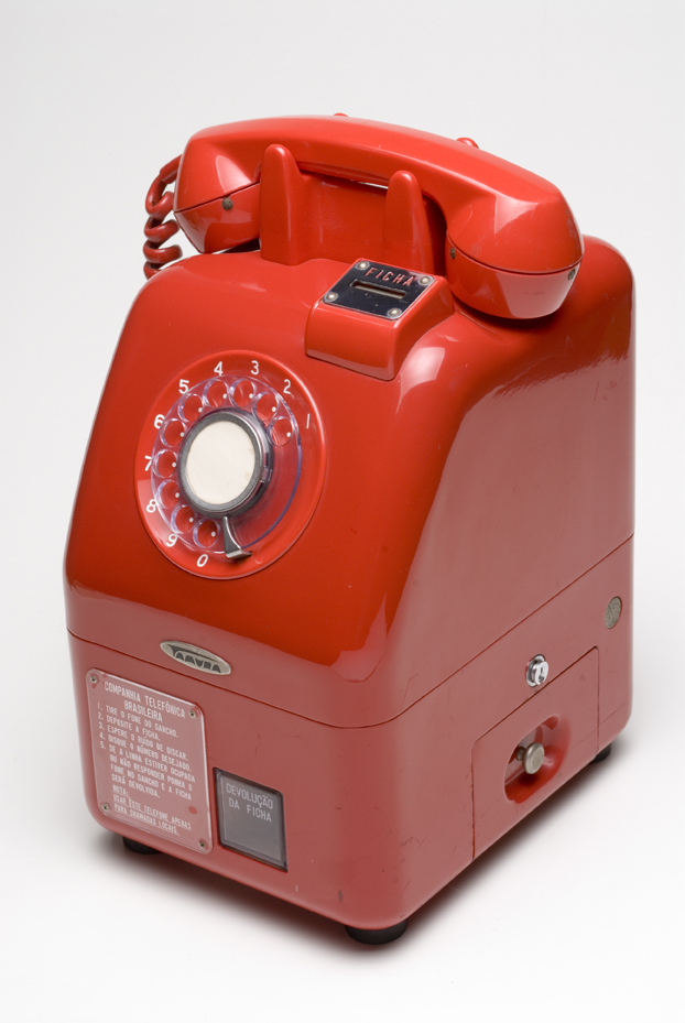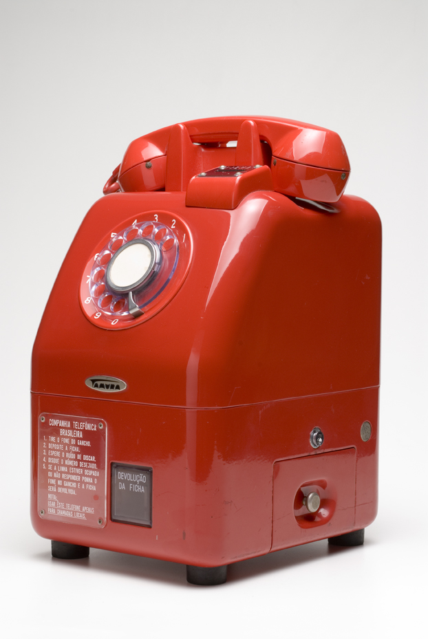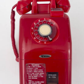 Telefone público automático na cor vermelha. Caixa possui, na parte frontal, disco completo com batedor de dedo metálico em formato de arco e placa manipuladora em acrílico transparente contendo, no centro, porta etiqueta circular com etiqueta. Embaixo da placa manipuladora, numeração de 1 a 0 em semicírculo na cor branca com fundo vermelho. Abaixo, placa em metal com a logomarca do fabricante. Abaixo, no lado esquerdo, placa de acrílico com as instruções de como utilizar o telefone. No lado direito, compartimento para devolução de ficha. Na parte superior, à direita, compartimento para introdução da ficha telefônica. Atrás, suporte para monofone em plástico na cor vermelha. Na lateral direita, caixa coletora de fichas telefônicas com fechadura. Na lateral esquerda, saída com cordão espiralado na cor vermelha que liga a caixa ao monofone. O monofone é uma peça inteiriça na cor vermelha. Na parte posterior, placa metálica da empresa com especificações técnicas sobre o telefone. Base com quatro pés de borracha na cor preta.